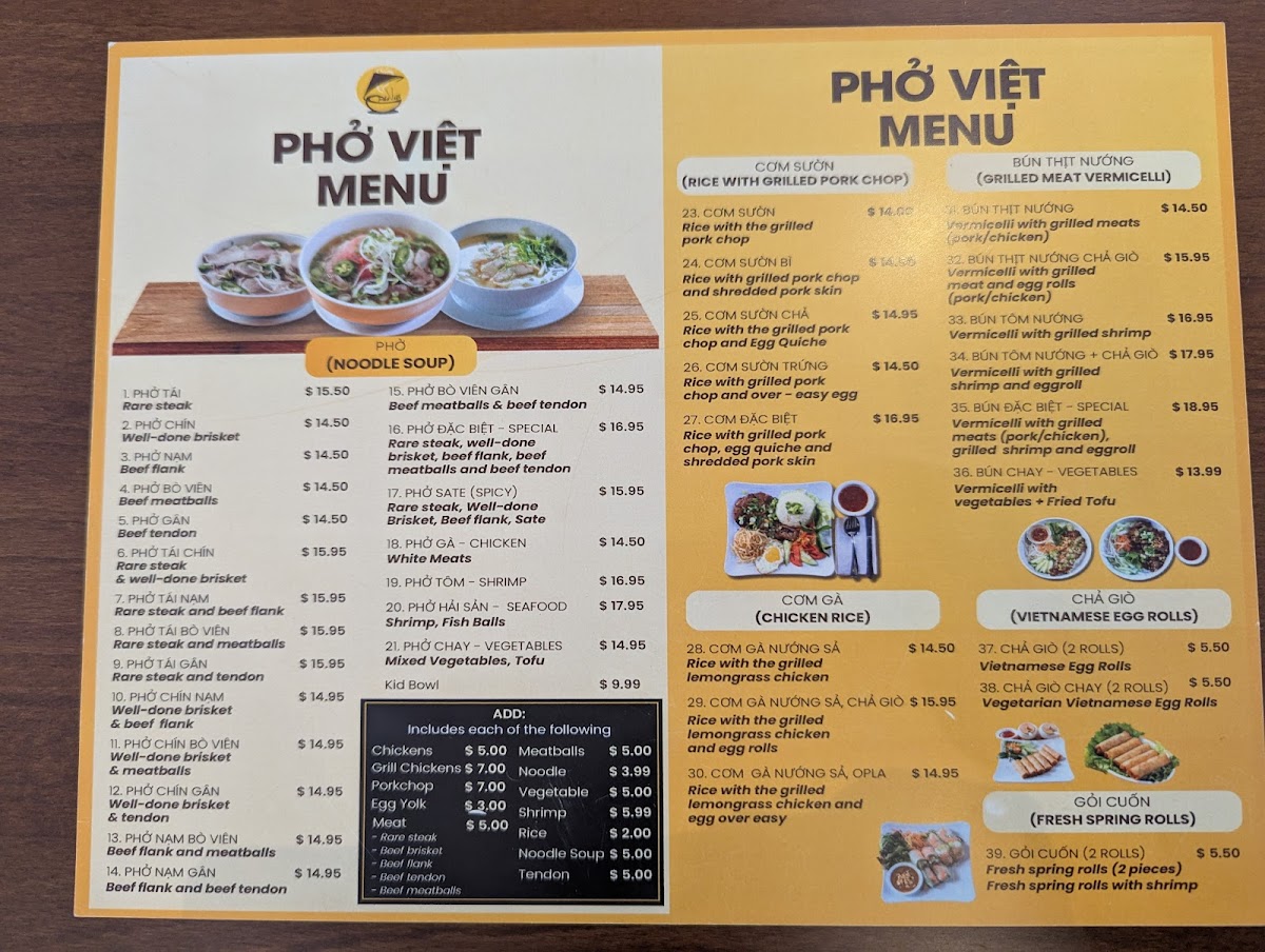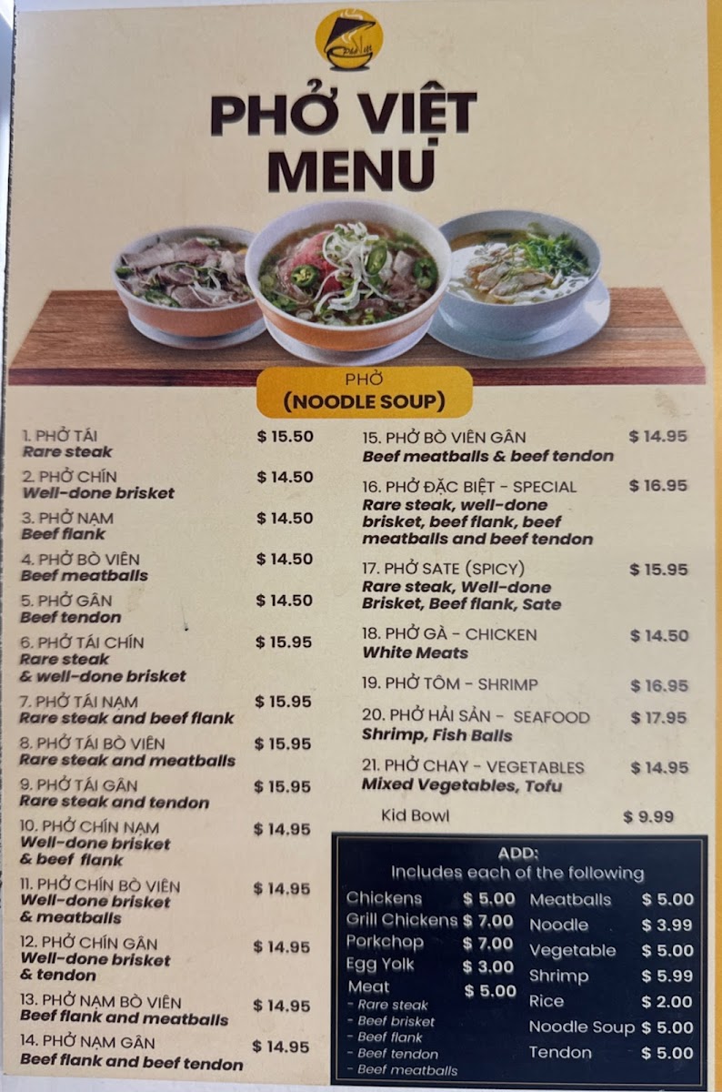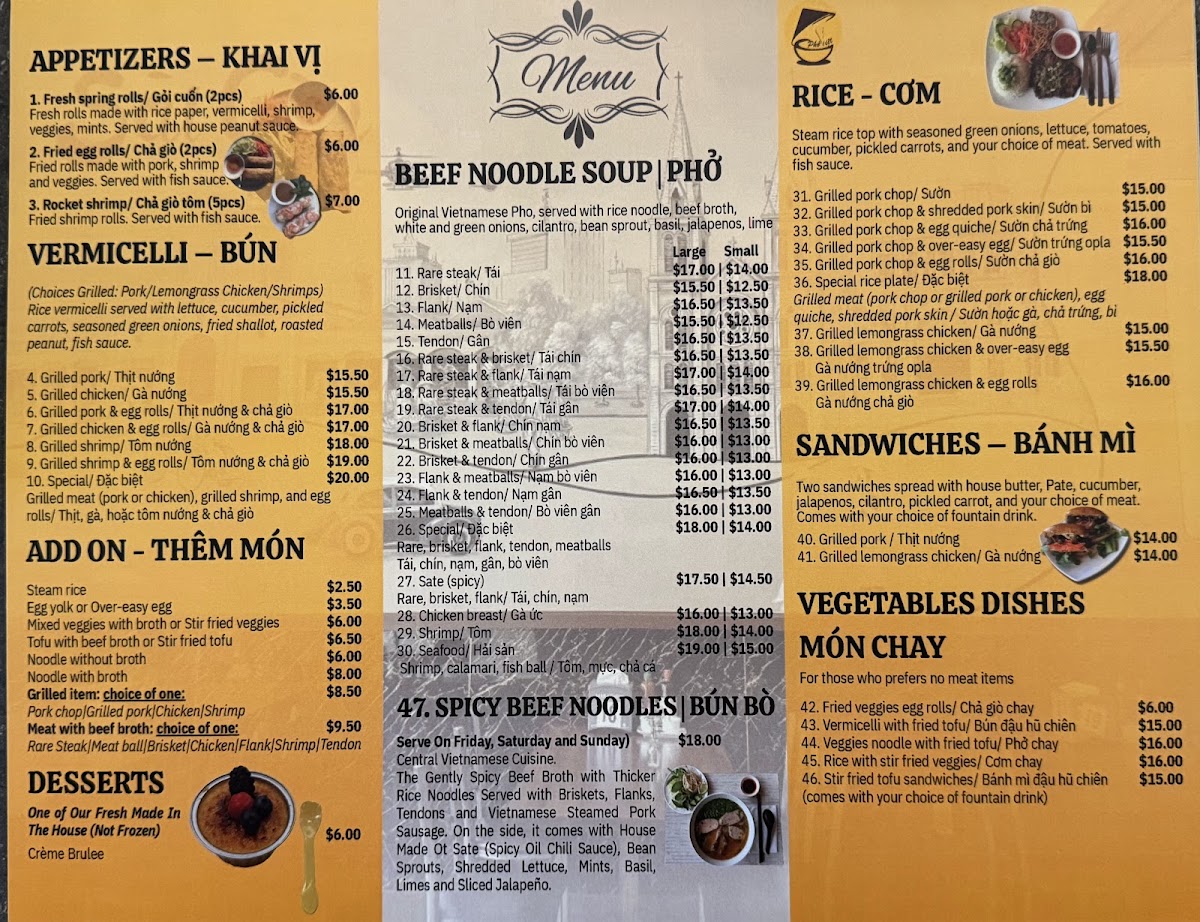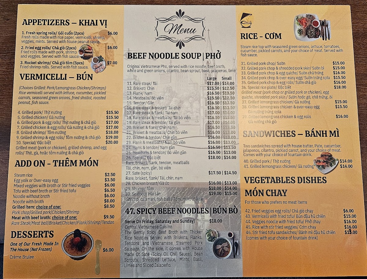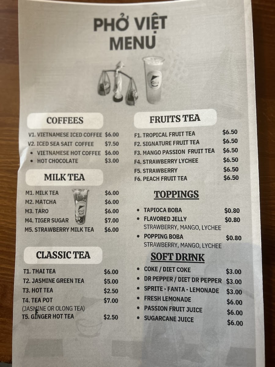The menu at Pho Viet offers a straightforward yet satisfying selection of Vietnamese dishes and refreshing drinks, perfect for a casual meal any time of day. Whether stopping by for a comforting bowl of aromatic pho or enjoying a plate of grilled lemongrass chicken with rice, the options invite a relaxed and approachable dining experience.