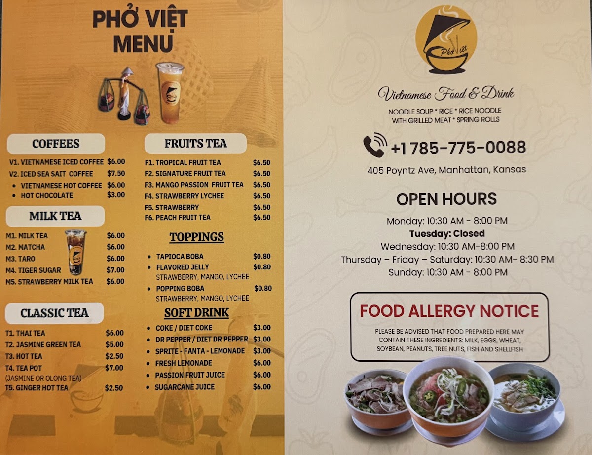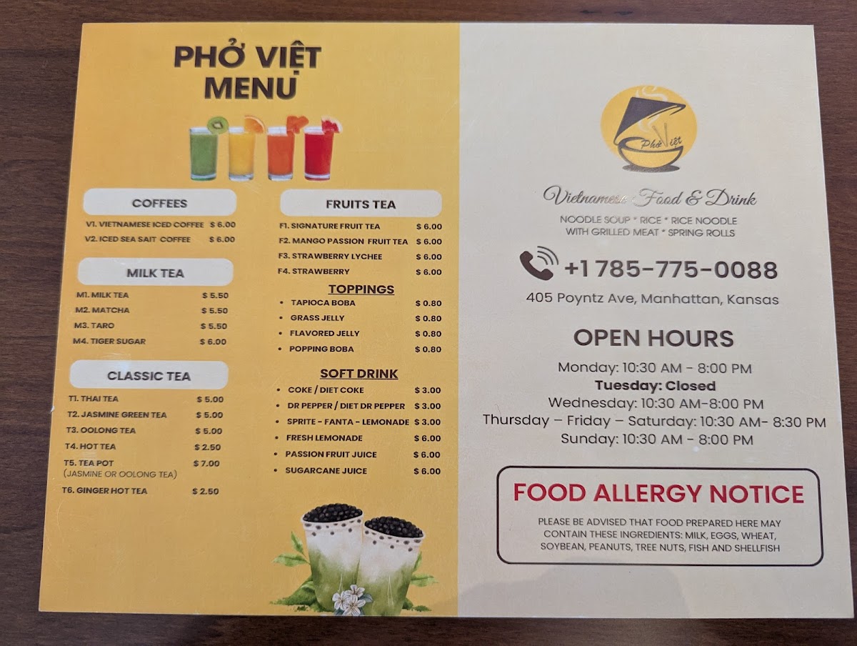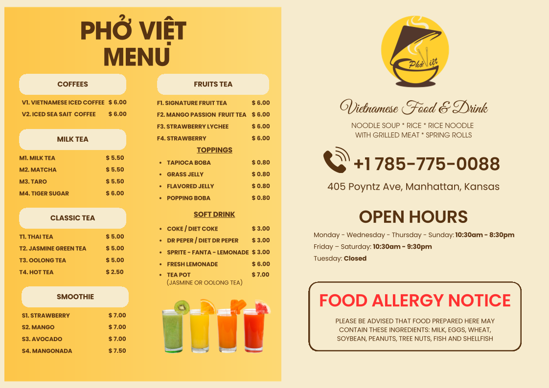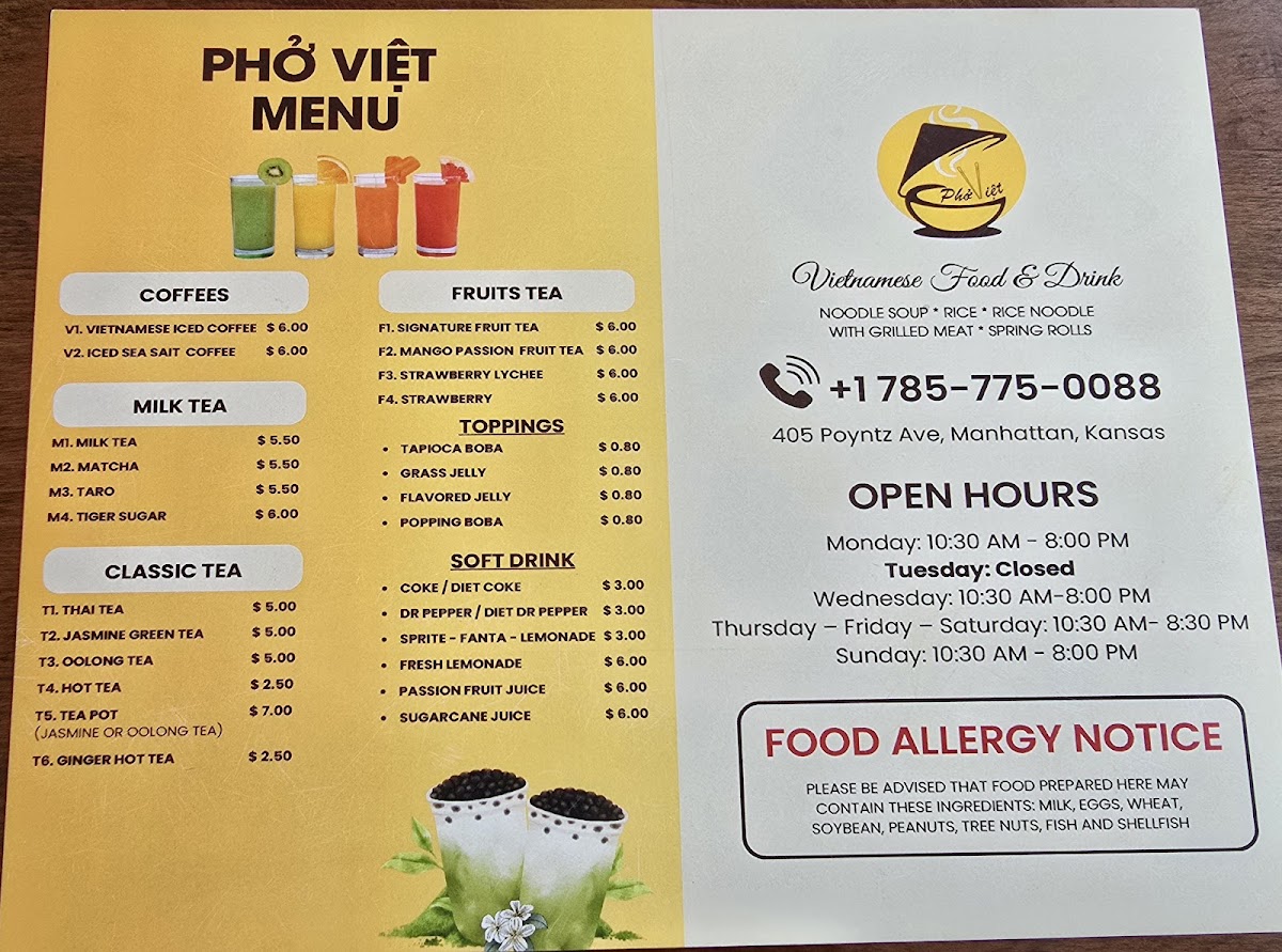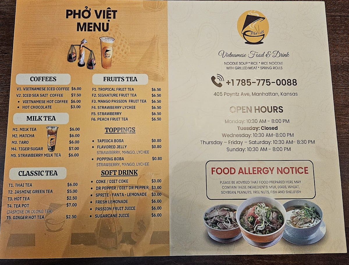 The menu at Pho Viet offers a straightforward yet satisfying selection of Vietnamese dishes and refreshing drinks, perfect for a casual meal any time of day. Whether stopping by for a comforting bowl of aromatic pho or enjoying a plate of grilled lemongrass chicken with rice, the options invite a relaxed and approachable dining experience.